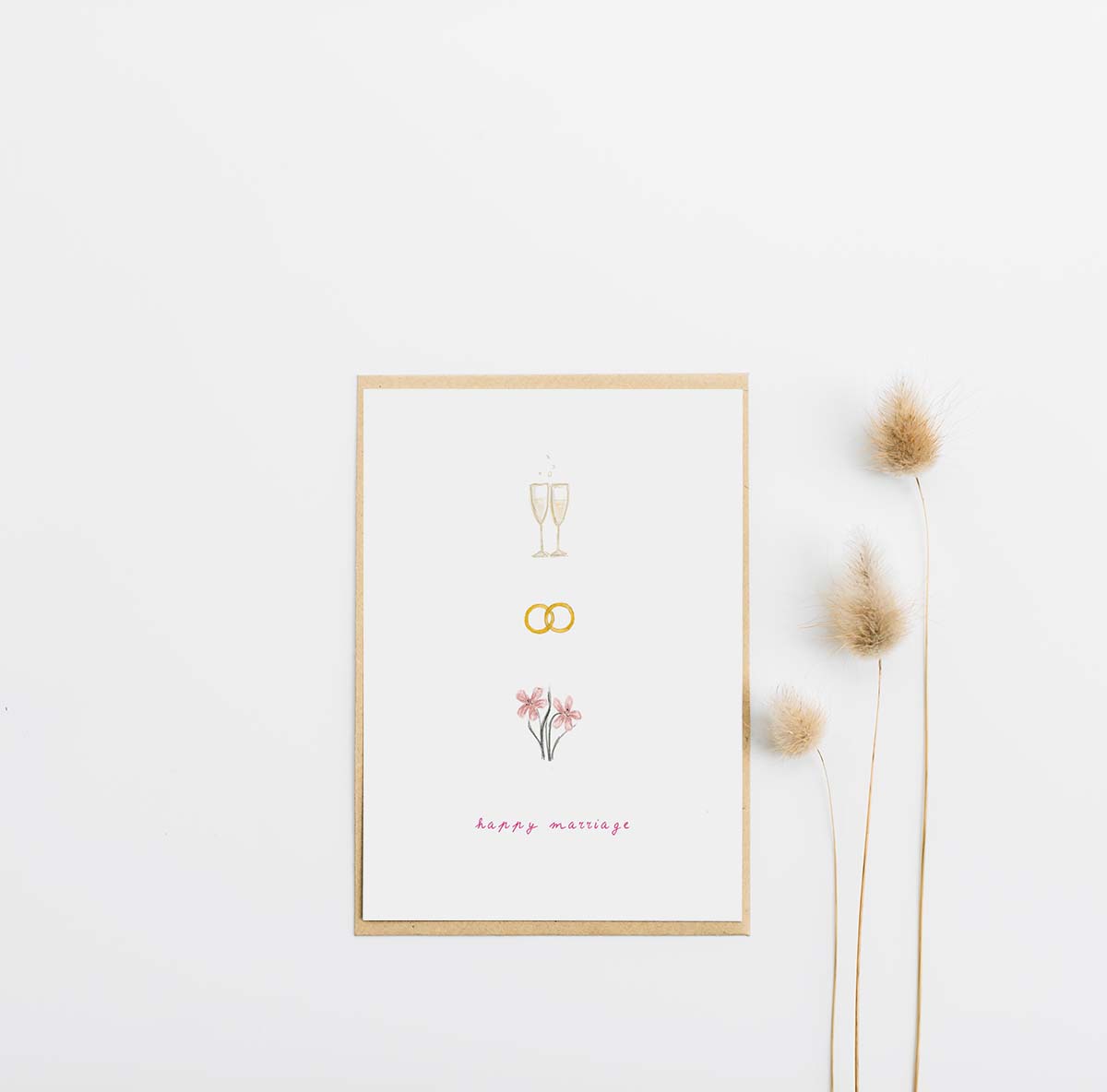 Wenskaart met tekst 'happy marriage'.